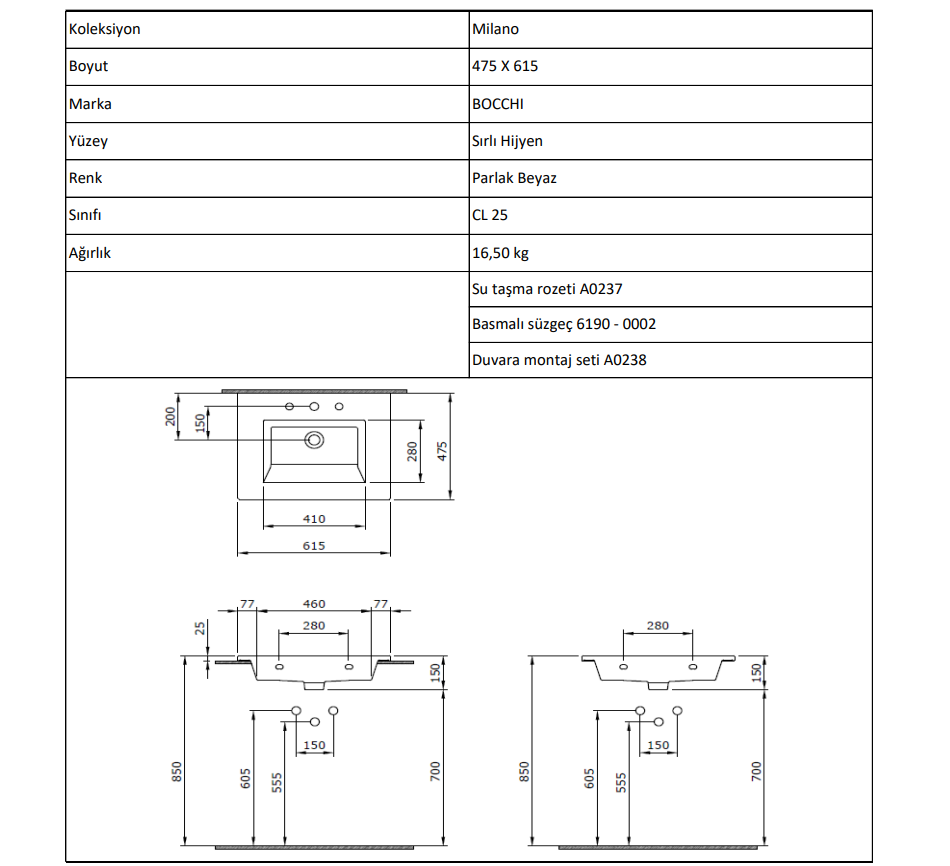 Bocchi Milano Etajerli Lavabo 60 cm Parlak Beyaz